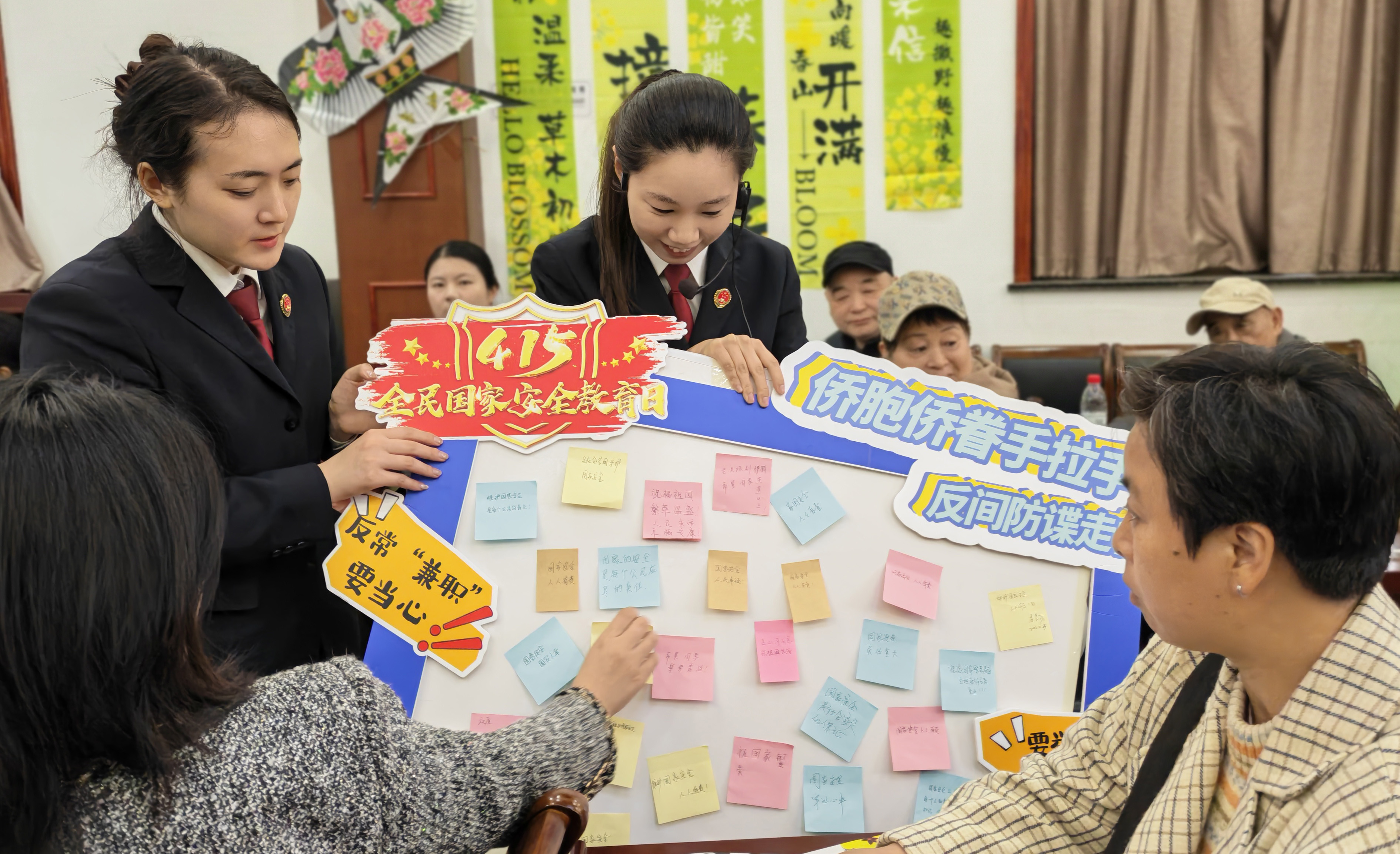 近日,江苏省南京市人民检察院、市侨联等联合举办“全民国家安全教育日”主题活动,检察干警结合案例解读总体国家安全观,并组织群众在彩色便利贴上写下“我和国安的一句话”。图为参加活动的群众将写好的便利贴贴在展示板上。