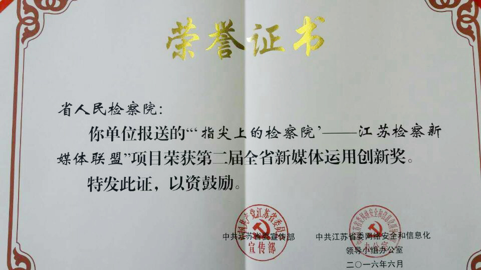 6月28日上午,由中共江苏省委宣传部、省委网信办联合举办第二届江苏省新媒体运用创新奖评选活动在南京揭晓,被誉为“指尖上的检察院”ag尊龙凯时 新媒体联盟荣获第二届全省新媒体运用创新奖。