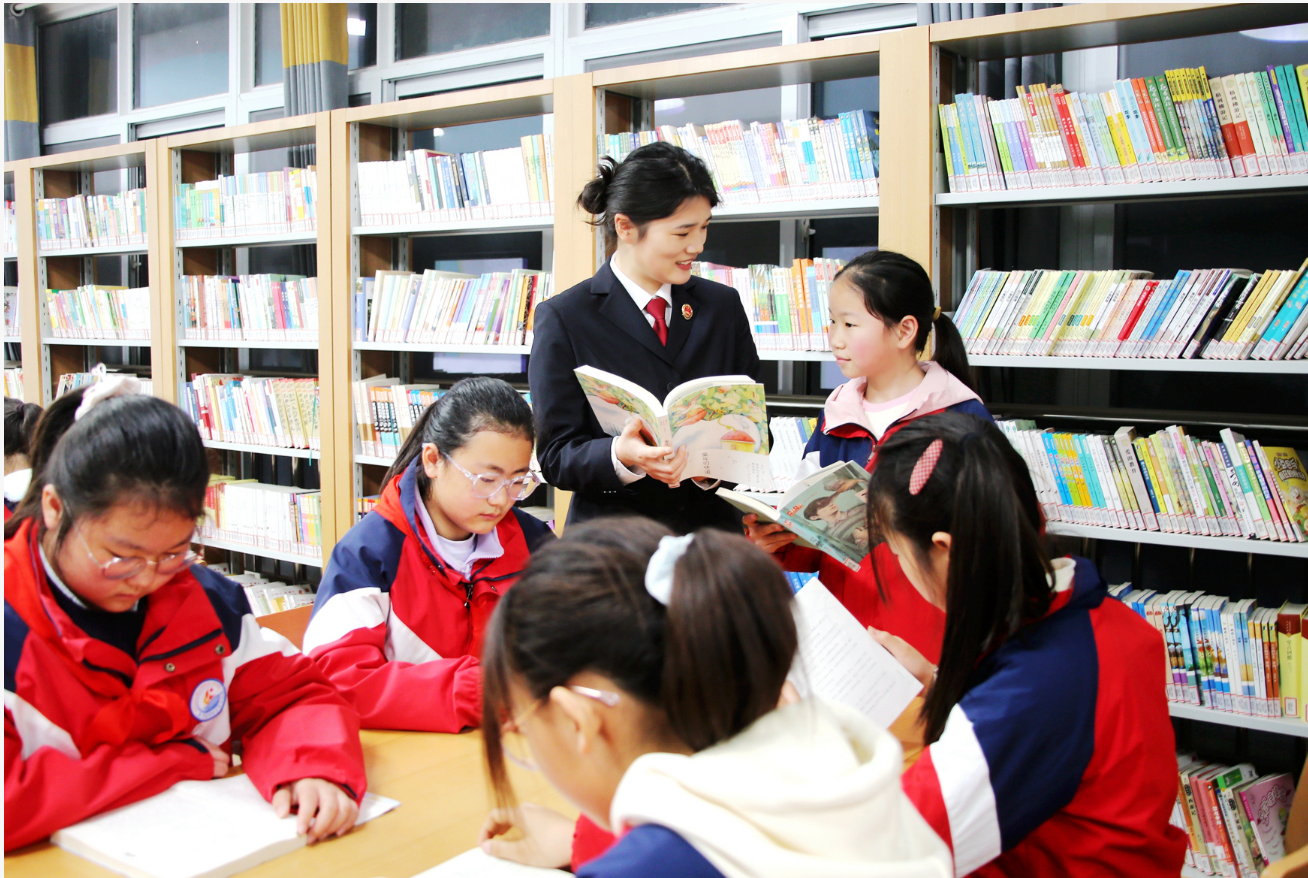 近日,睢宁县检察院“小雨滴”普法团队走进县第二实验小学,检察干警与孩子们共同举行“书香润童心 法治伴成长”共读一本好书主题阅读活动,助力青少年在阅读中成长,在法治护航下前行。图为干警和学生交流读书心得。(张亚东 摄)