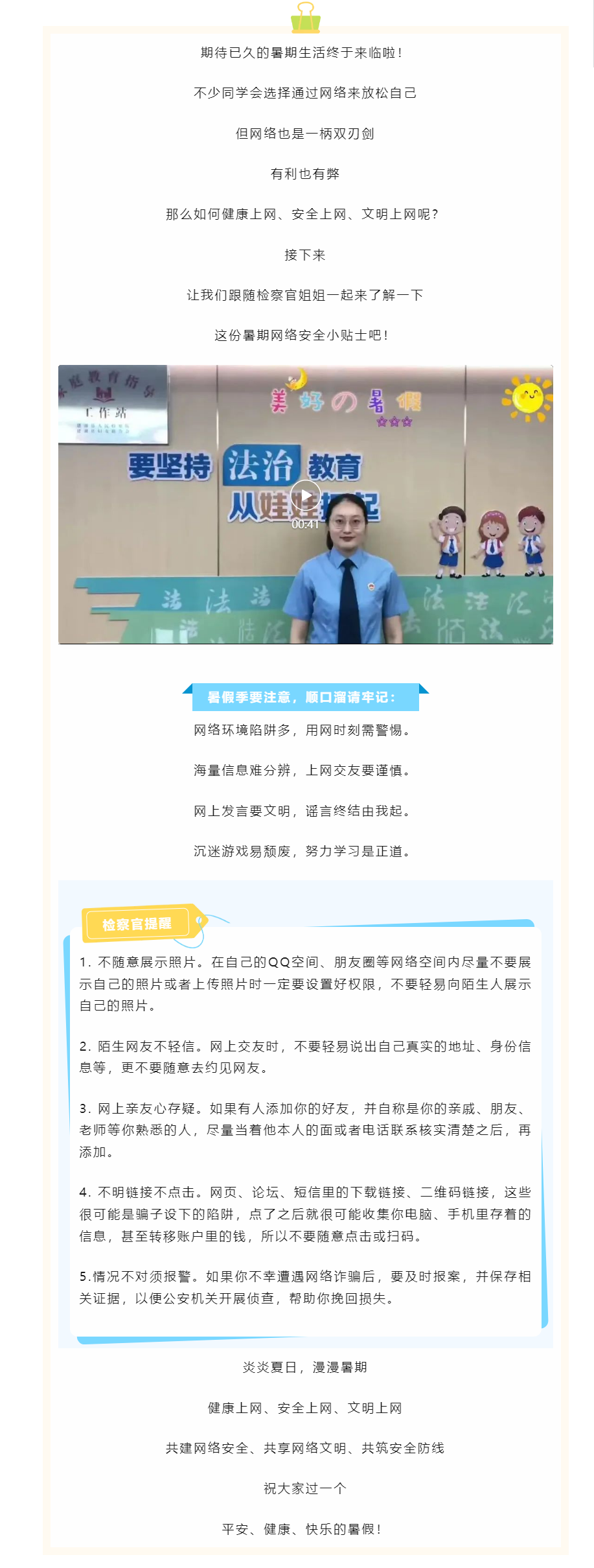 网络有利也有弊 跟着建湖县检察官一起了解暑期网络安全小贴士
