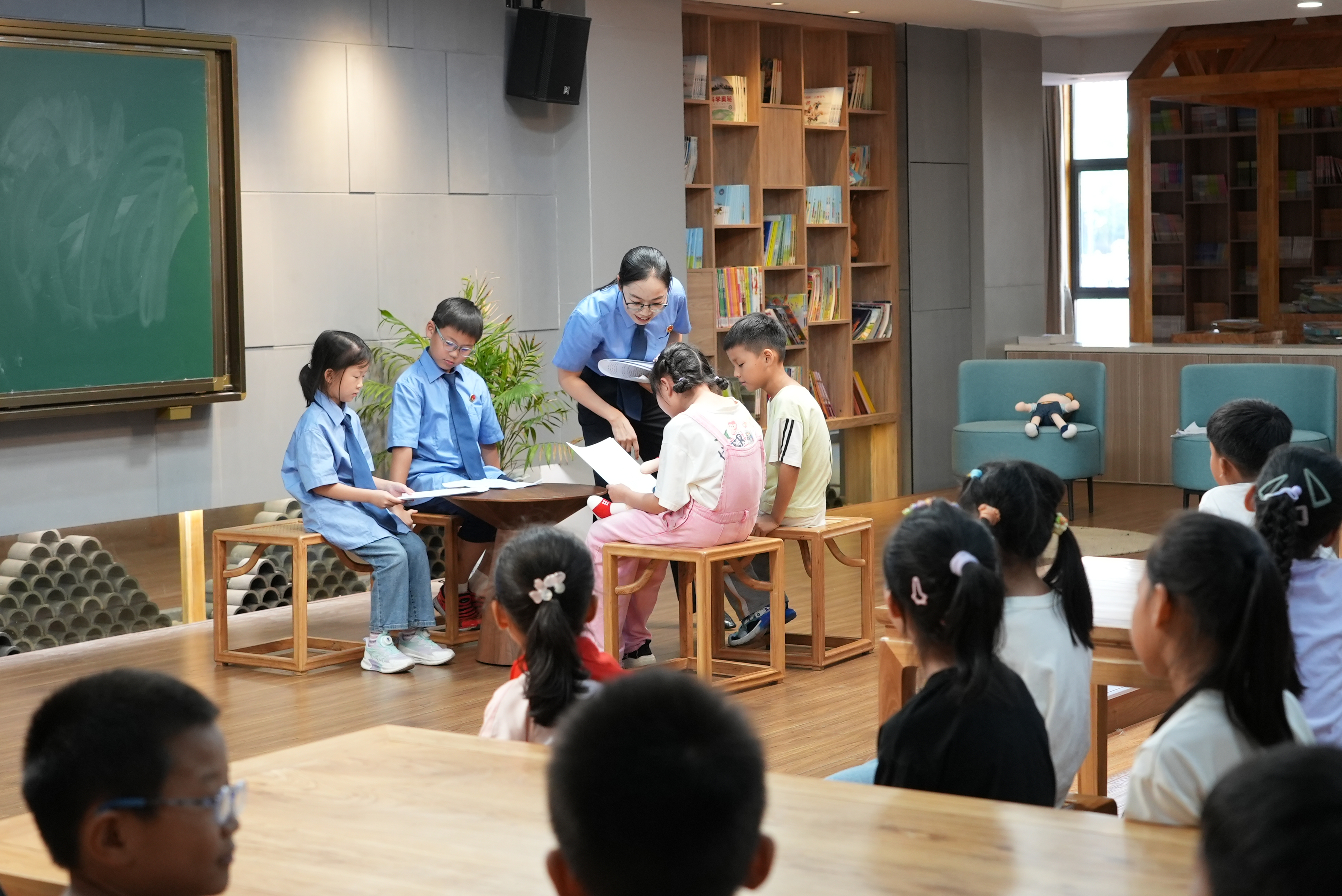 这是江苏省盐城市“湖海未检”法治宣讲团成员、盐城经开区检察院检察官助理刘江在爱国主义教育专场法治讲座上与步凤中学的孩子们现场互动。