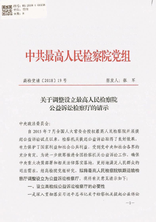 关于调整设立最高人民检察院公益诉讼检察厅的请示