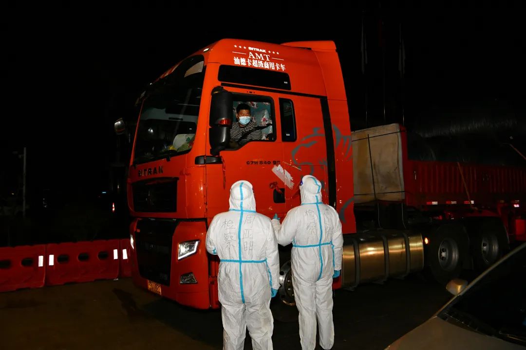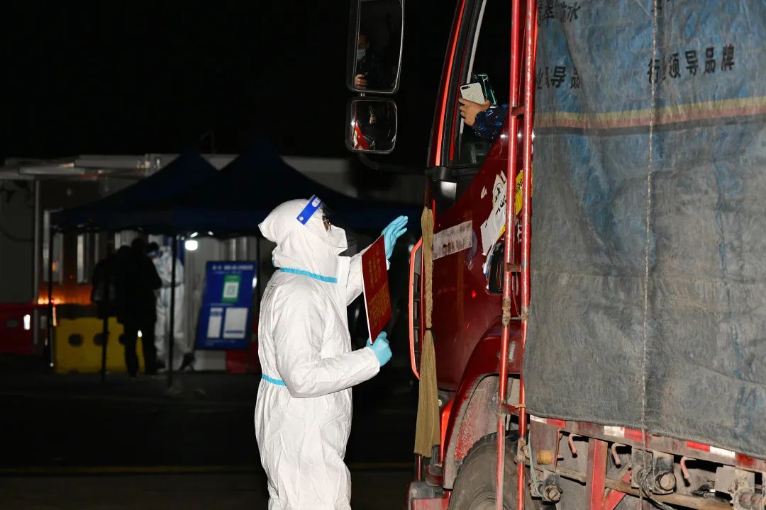医疗人员告诉我,在进入核酸采样区后,皮肤不能外露,不能喝水吃东西。如要出去,脱防护衣要严格执行“一脱二脱三脱”的流程。17时30分左右,卡口执勤人员的晚饭送到。但当时正是最忙的时候,我心想等忙过这一阵再吃,于是继续工作:登记驾驶员的信息、点击核酸确认采集键、标注核酸结果、再告知发放通行证的工作人员核酸结果。这样循环往复地做着这一系列的工作,这样一干就干到了半夜交接班,肚子也“咕咕”叫起来。