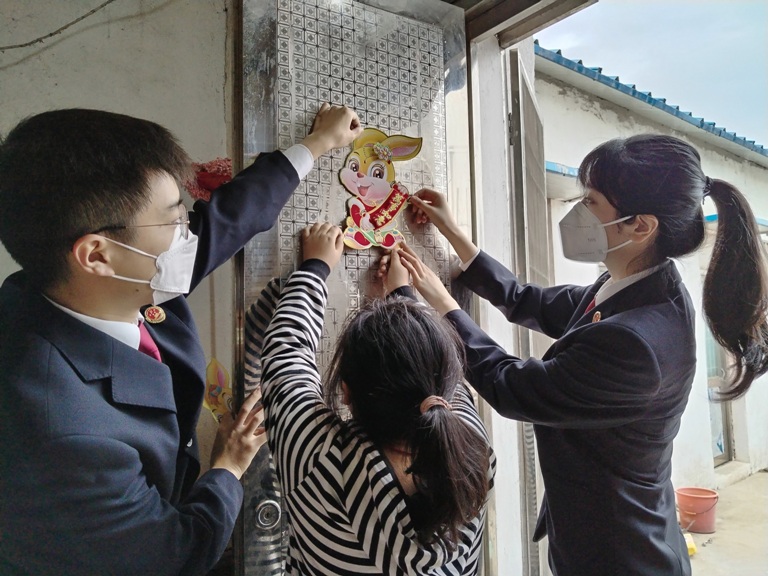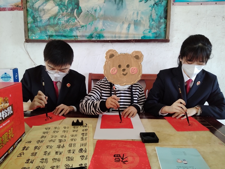 写福字、书幸福。靖江市检察院干警同孩子们一起写福字、贴年画,以此寄托孩子们对美好生活的向往。