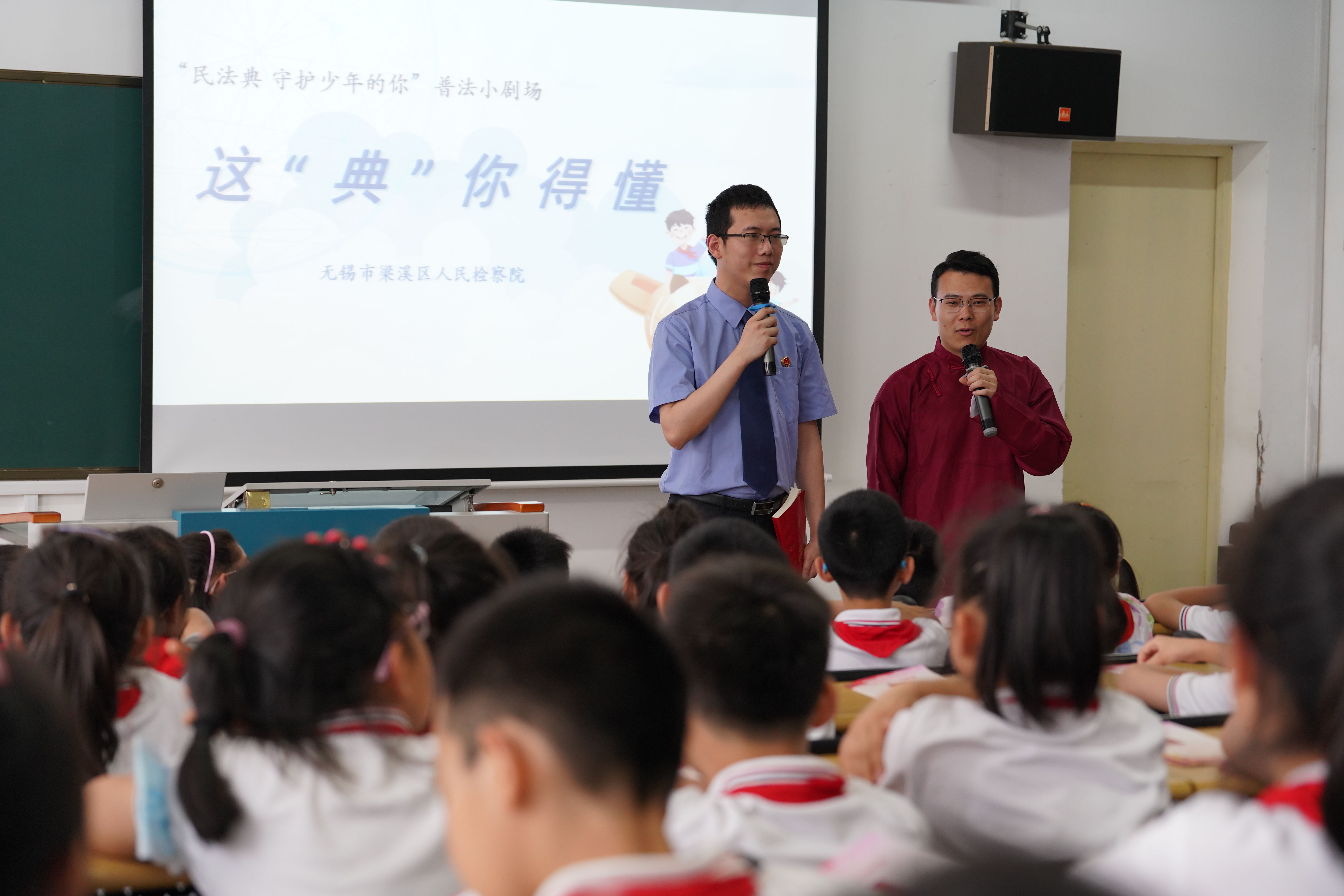 为进一步做好民法典宣传工作,江苏省无锡市梁溪区检察院检察官近日走进辖区辅侨实验小学,开展“法润童心护成长‘典’亮校园守未来”法治宣传活动。该院检察人员为同学们带去自编自演的民法典宣传相声——《这“典”你得懂》,将与同学们生活息息相关的民法典知识融入诙谐有趣的相声之中,真正实现了寓教于乐,受到同学们欢迎。