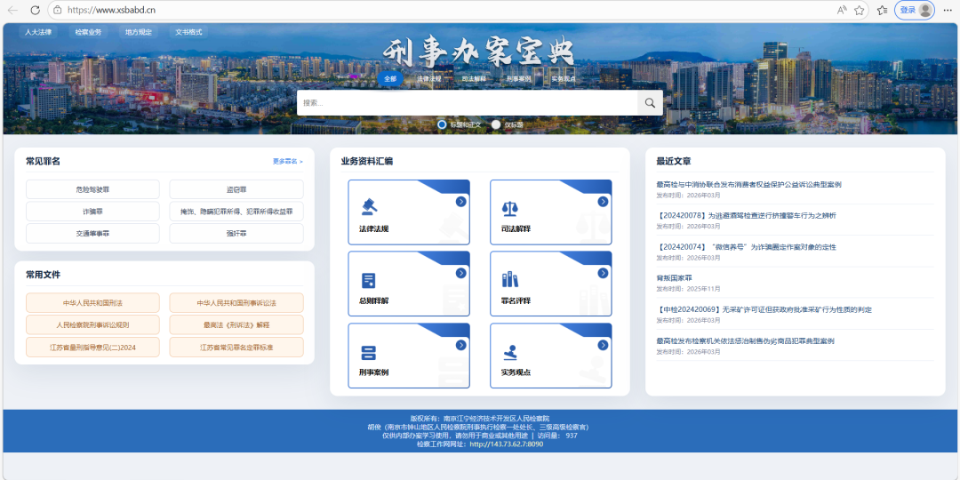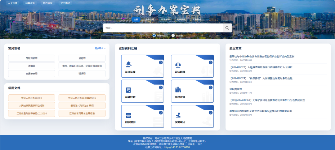 同时上线检察工作网端,输入网址//143.73.62.7:8090/,可直接进入,也可从南京江宁经济技术开发区人民检察院工作网网站ag尊龙凯时-飘窗点击“检察办案宝典”,或网站ag尊龙凯时-服务通道-“检察办案宝典”进入。