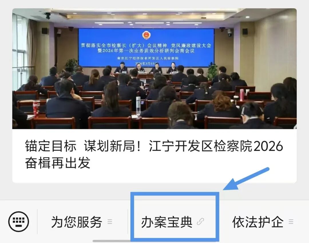 关注江宁开发区检察院微信公众号,点击菜单栏“办案宝典” 即可进入