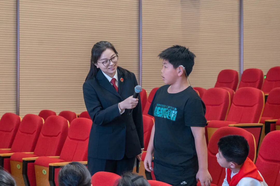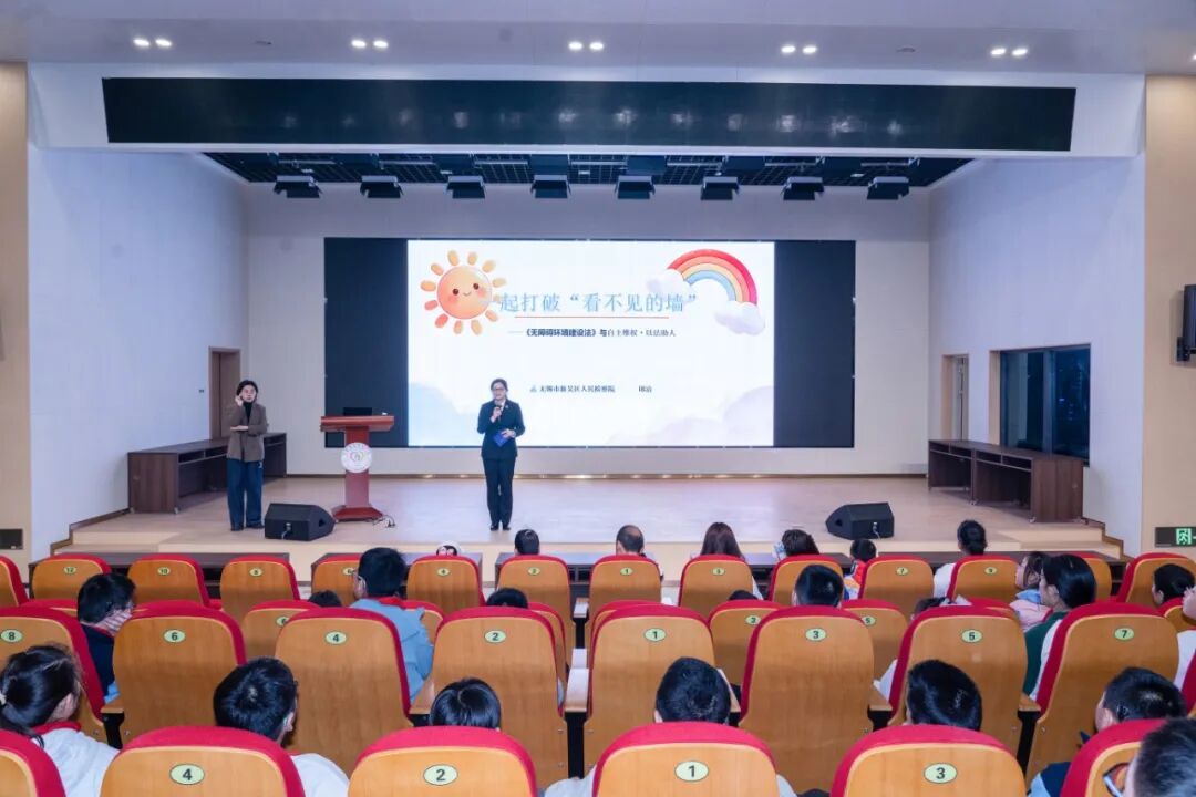 法治是未成年人健康成长的坚实屏障。针对特需未成年人群体,新吴区人民检察院未成年人检察部检察官邱洁带来以“特需未成年人自护与法治教育——自助维权·以法助人”为主题的法治讲座。讲座中,邱洁检察官深入讲解《无障碍环境建设法》核心条款,结合真实案例让无障碍的理念更深入地融入教育教学和校园管理的每一个细节,帮助学生们尊重差异,乐于助人,成为“无障碍环境”最重要的建设者。朱苓君老师则结合自身成长经历与无锡教育“助人自助”项目实践案例,分享自主维权、积极参与无障碍环境倡导的宝贵经验,让学生们直观理解“自助”与“助人”的深刻意义。为保障视障、听障学生无障碍接收学习信息,讲座全程配备专业手语老师同步翻译,确保每一位学生都能顺畅参与法治学习。