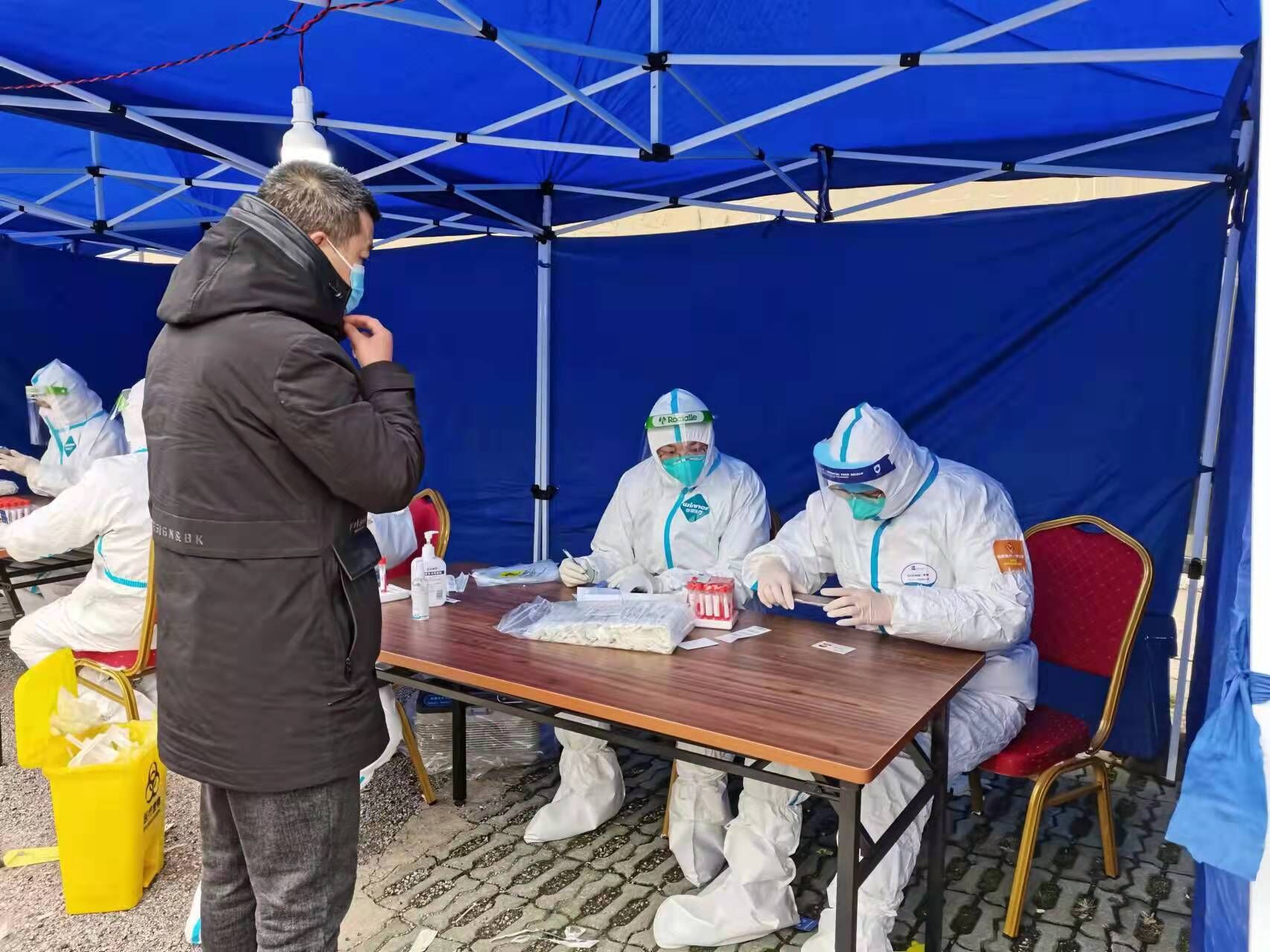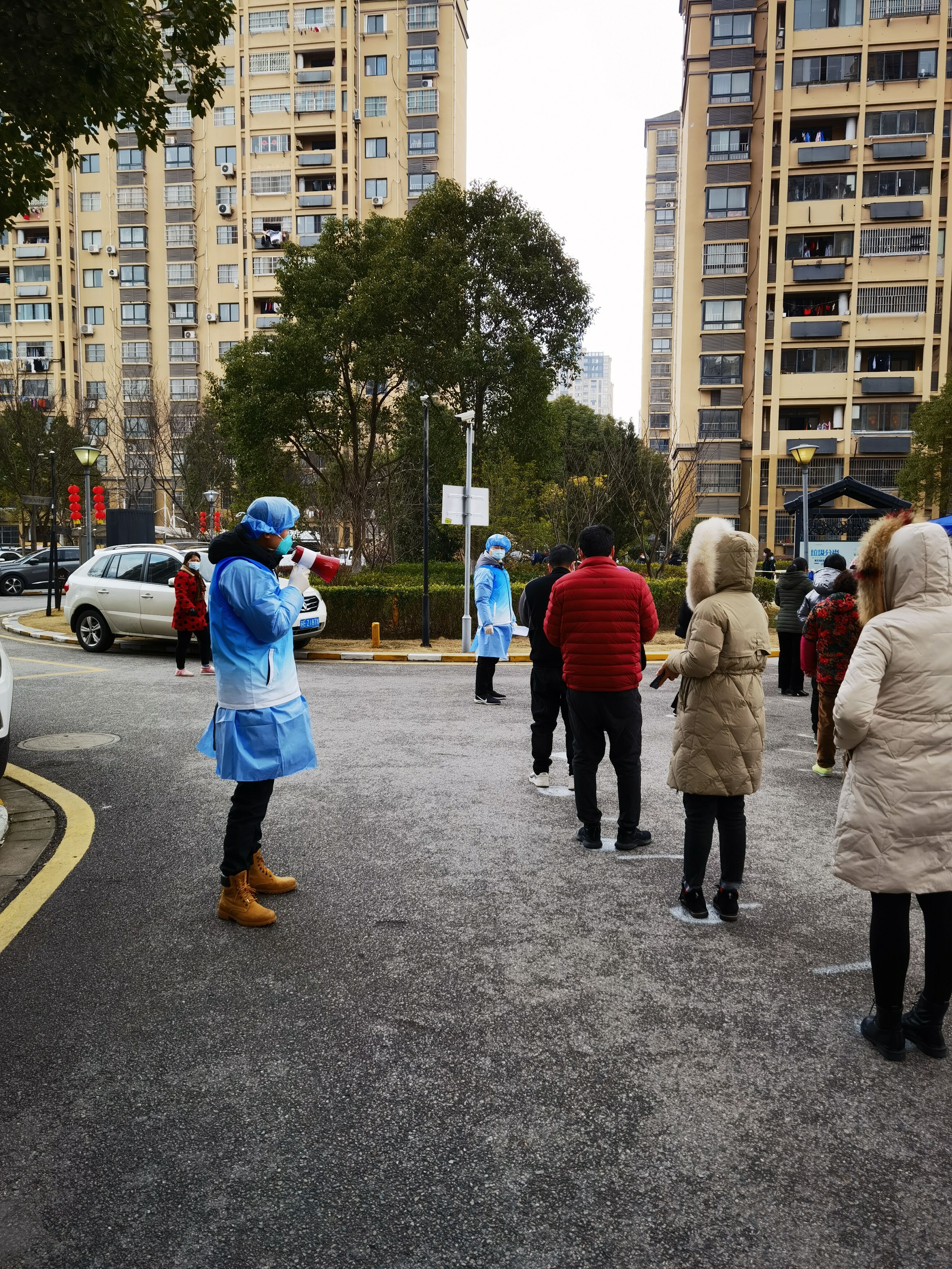 工作状态:我和其他60名检察干警继续奋战在防疫志愿者一线,正在负责核酸检测的测温和秩序维护。