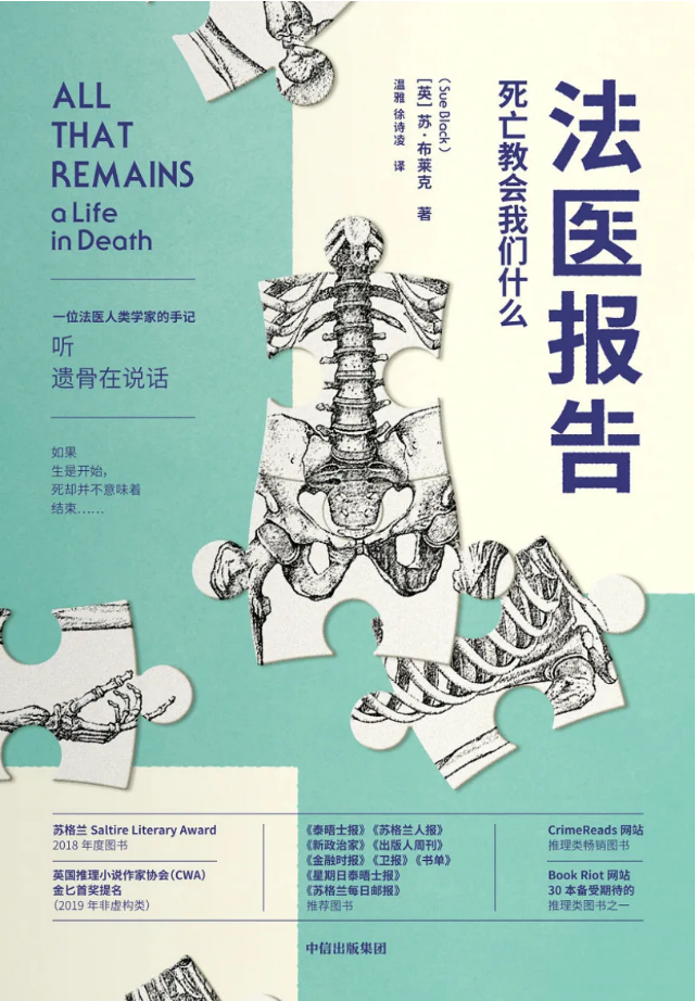 我会在书店里注意到这本《法医报告:死亡教会我们什么》,一方面是因为正关注“死亡对于人生的意义”的话题,另一方面是因为封面的推荐词,“一位法医人类学家的手记”“听遗骨在说话”“如果生是开始,死却并不意味着结束”。当然,还有这本书受到的各种推介:它曾入选英国《泰晤士报》等多家知名媒体的推荐榜单,被评为苏格兰 2018 年度图书,获得英国推理小说作家协会金匕首奖(非虚构类)提名。